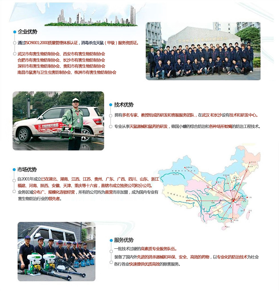 我們堅持“誠信、高效、安全、環(huán)保”的服務宗旨,所用器械均為世界優(yōu)質產品,所用藥物均系國家藥檢部門和衛(wèi)生防疫部門批準的安全、低毒的城市衛(wèi)生用藥,并根據具體作業環(huán)境和防治對象情況變化,制定具體防制方案,保證優(yōu)越的防治效果和人體安全。